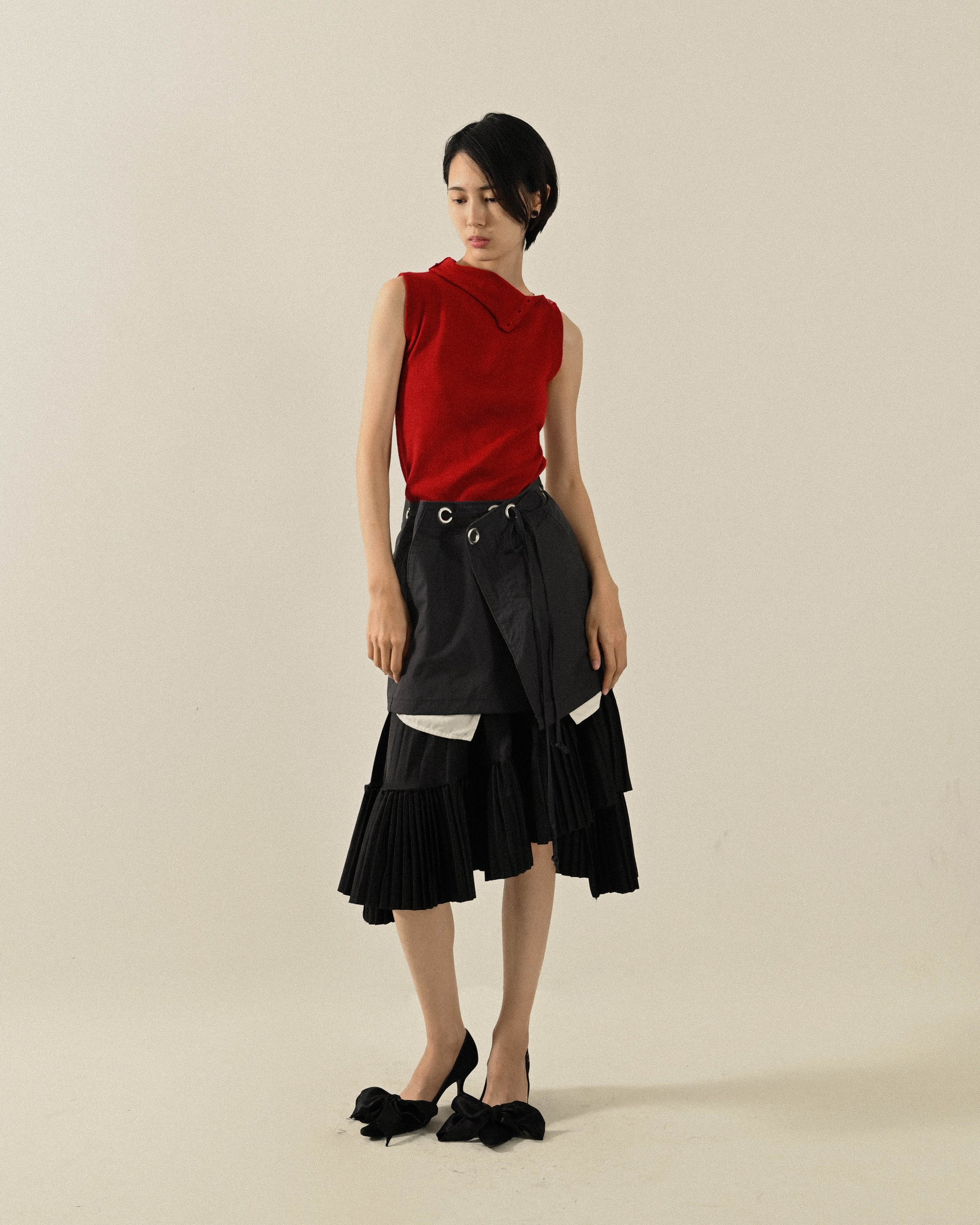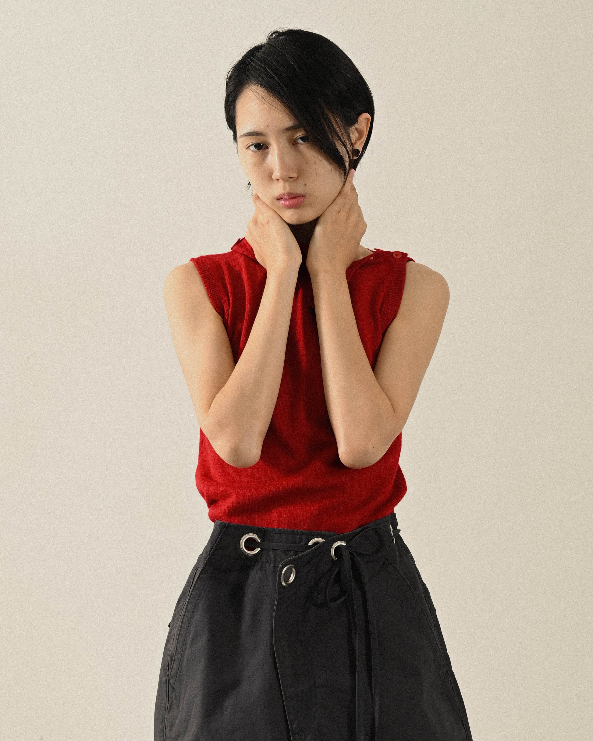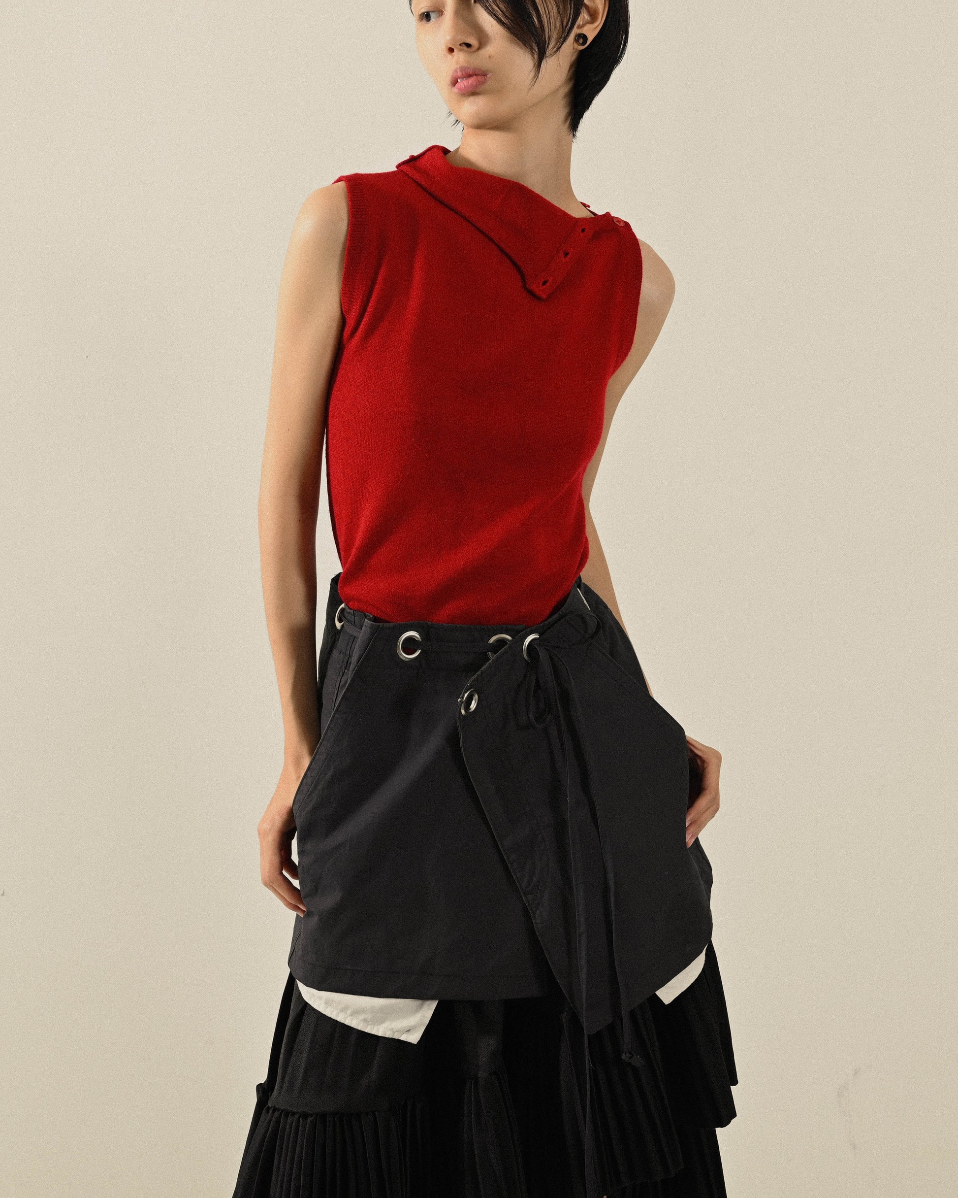 - 高領開釦設計。