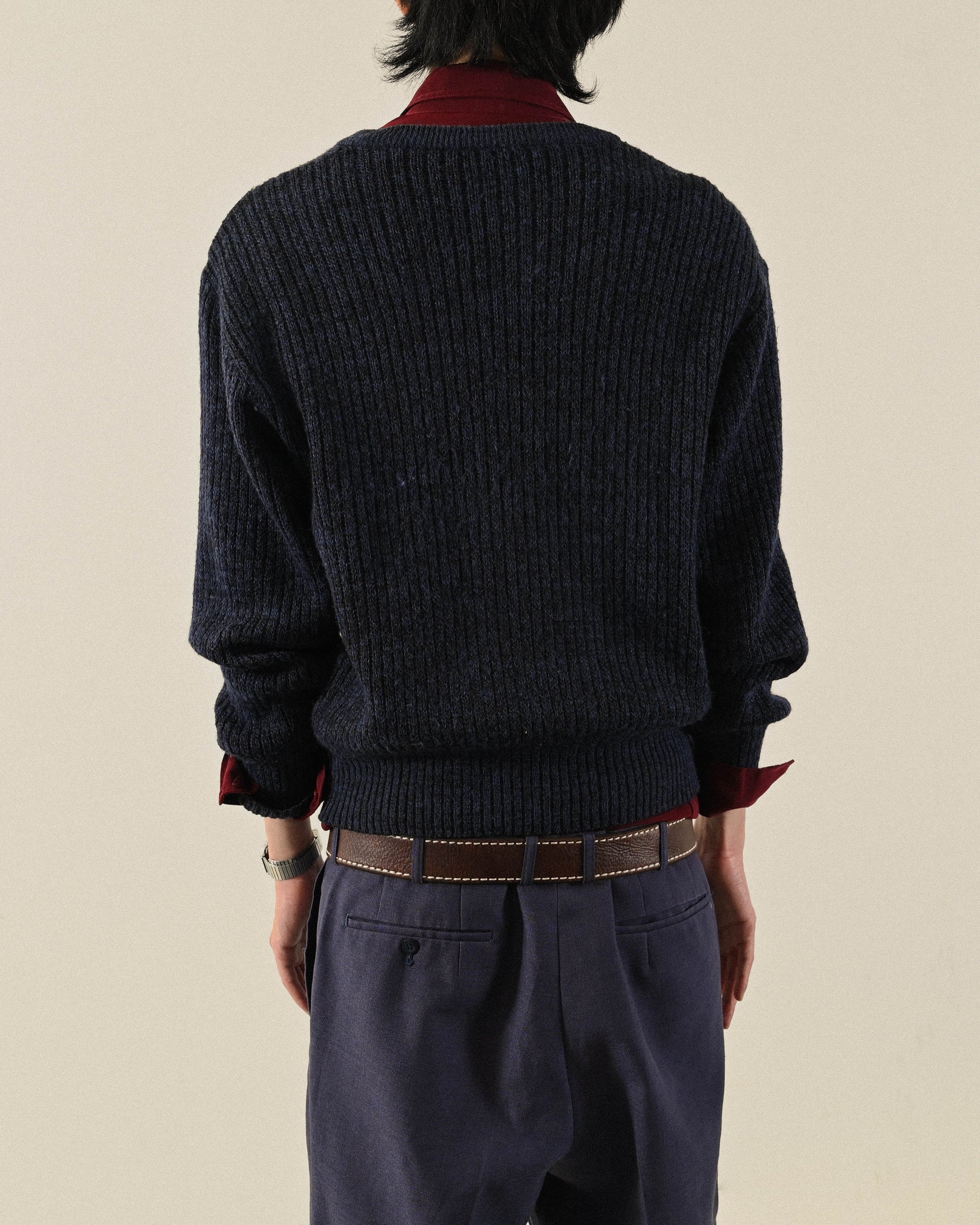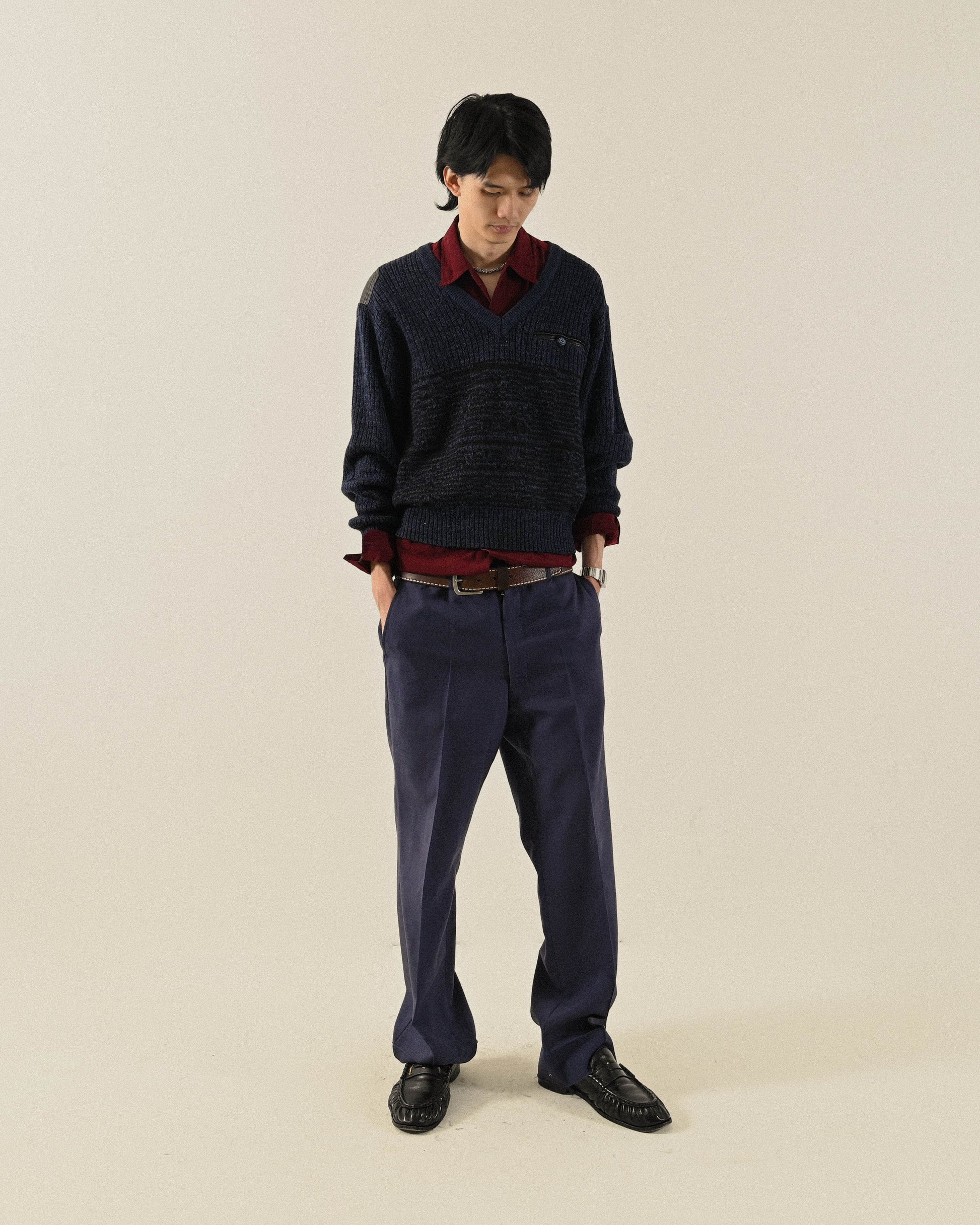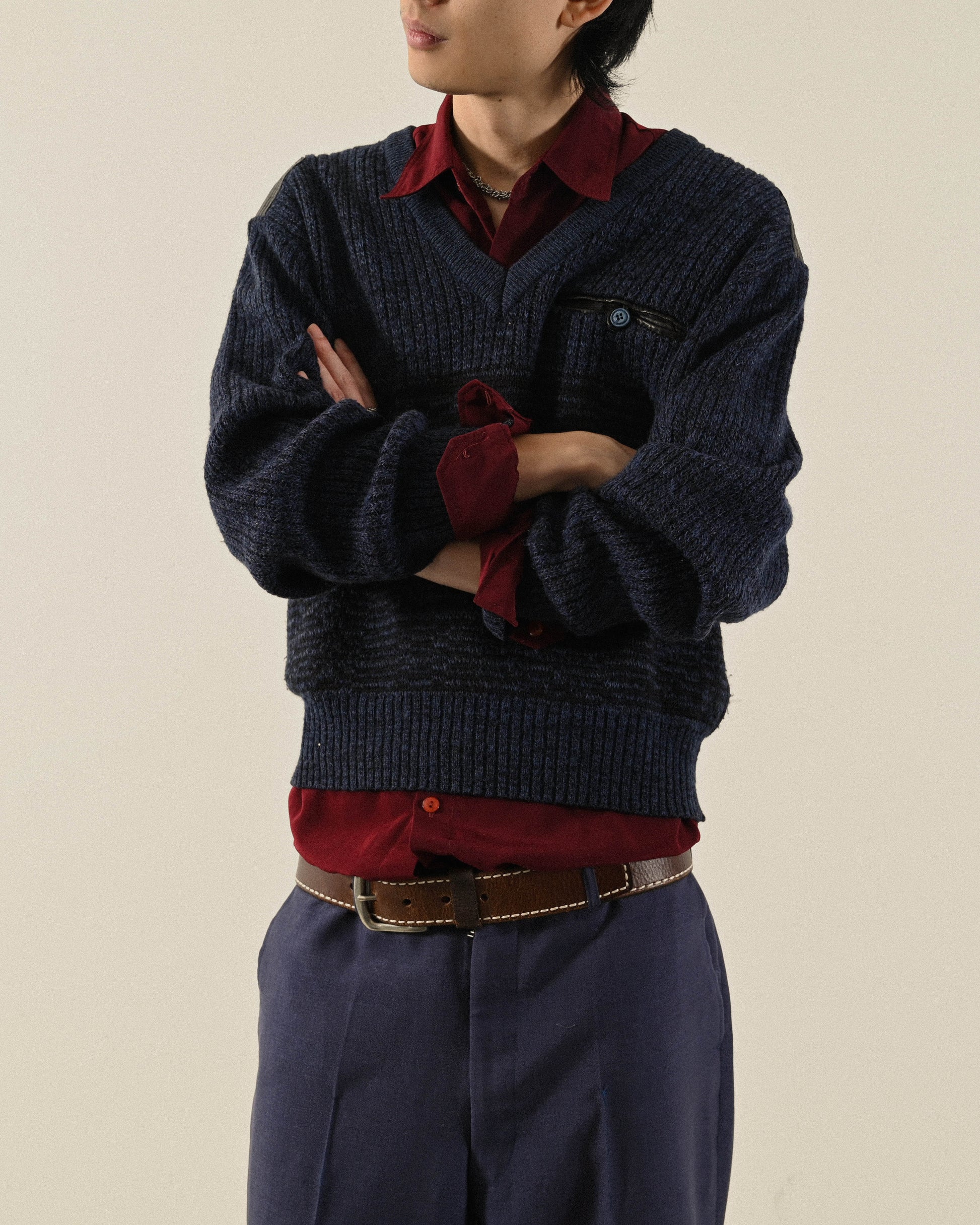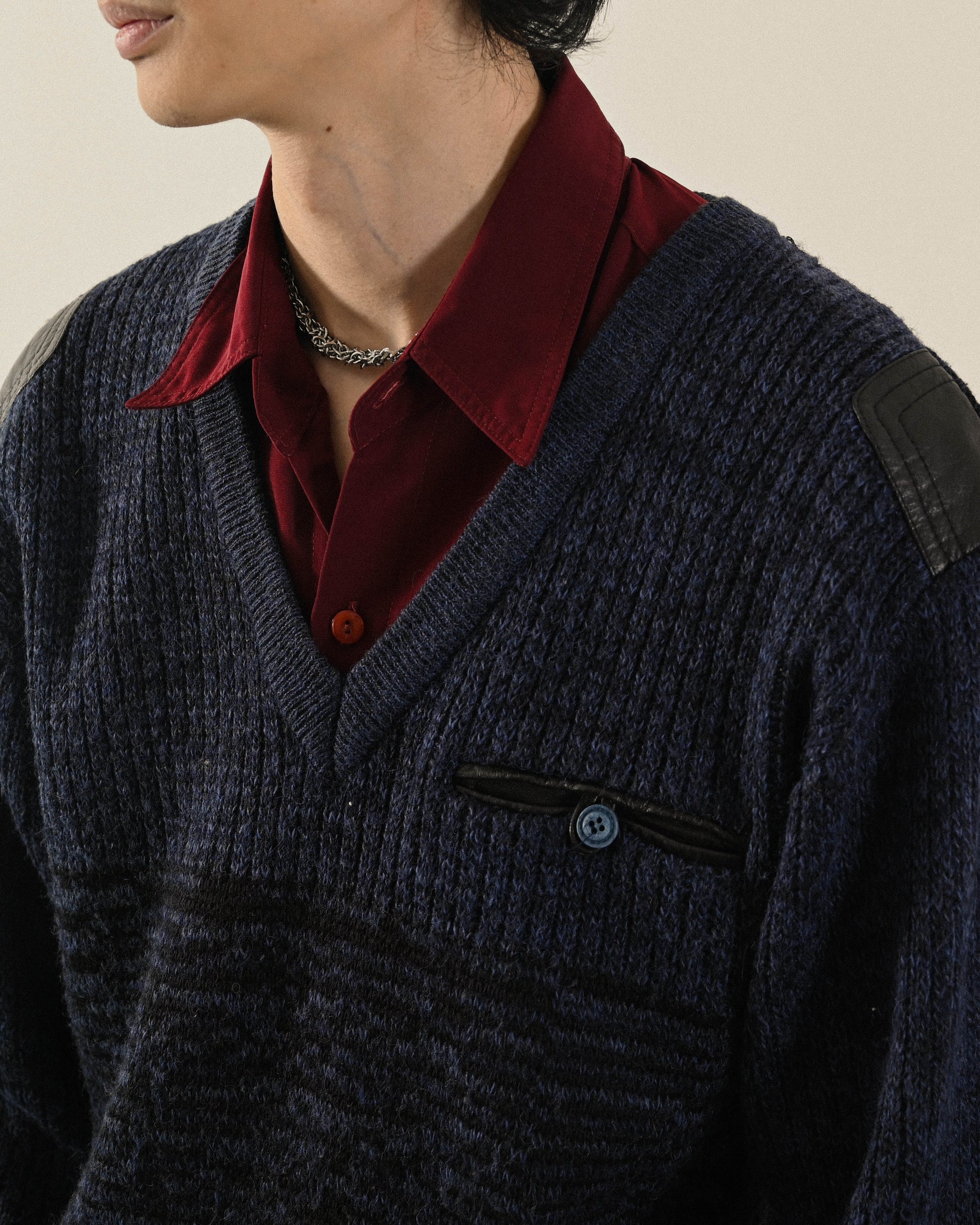 紋理拼接V領寬鬆古著毛衣