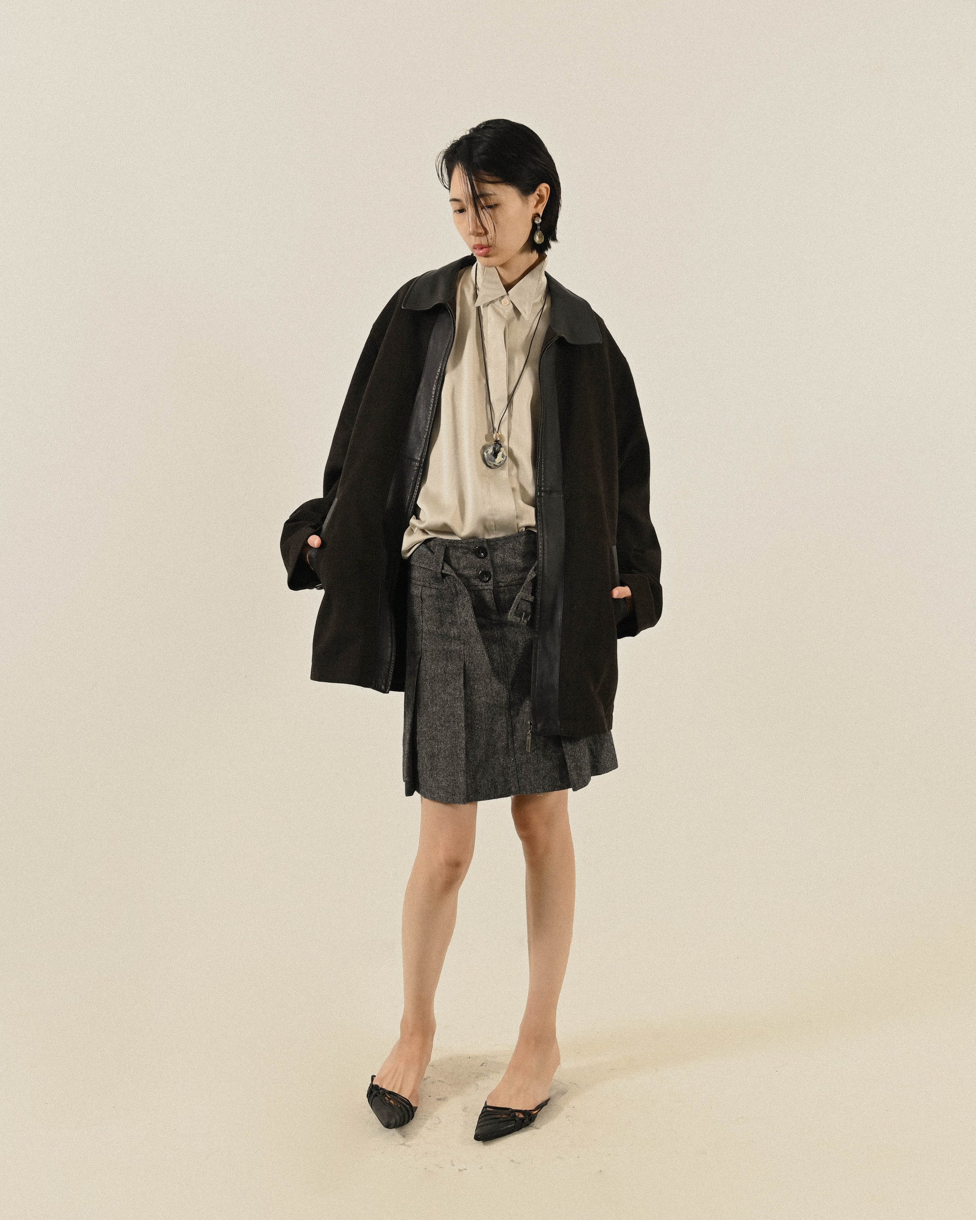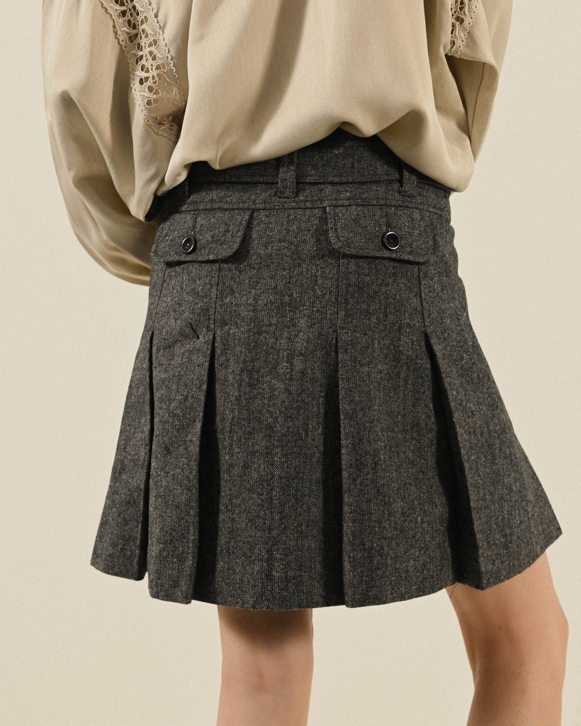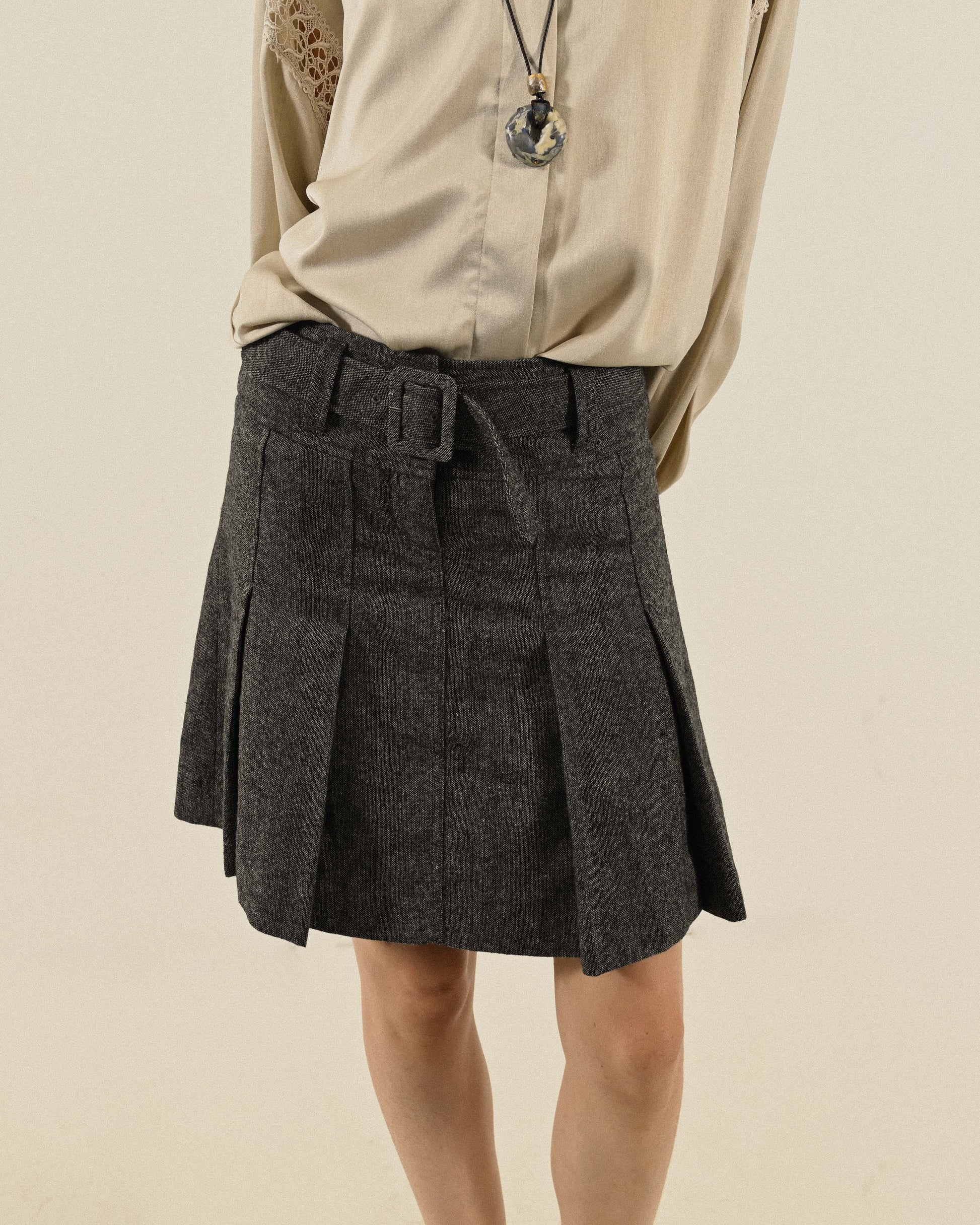 腰帶綴飾混色緹花古著百褶裙